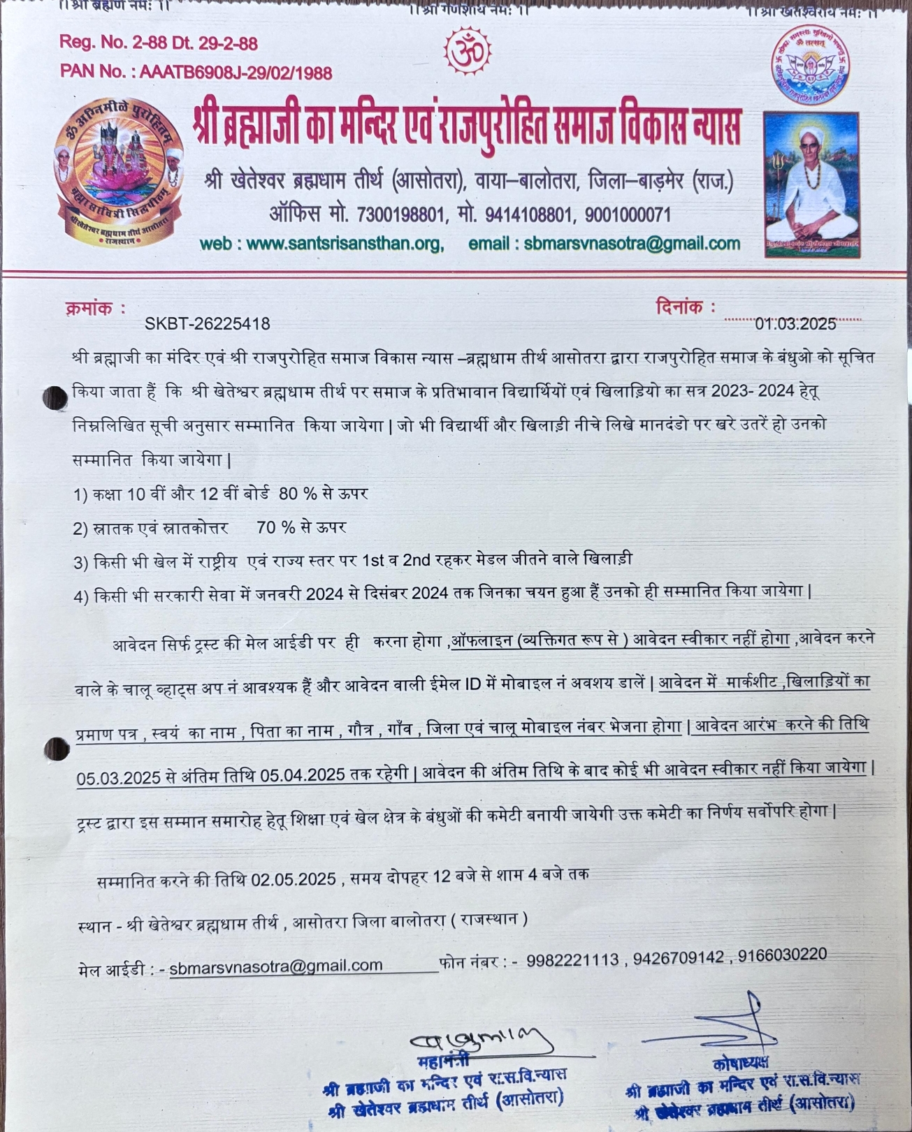 गुरू महाराज जी की प्रेरणा से ‘श्री ब्रह्माजी का मन्दिर एवं राजपुरोहित समाज विकास न्यास’ का गठन हुआ। इस न्यास में 51 सदस्य ब्रह्मोत्तर के सभी क्षेत्रों से प्रतिनिधित्व करते हैं।